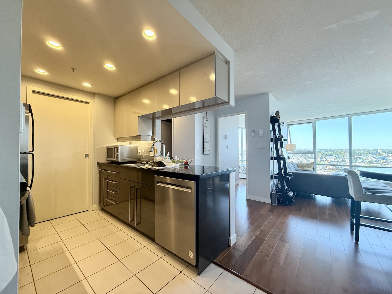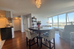 The kitchen is open to the main living/dining area, which has wood flooring, balcony access and spectacular views.