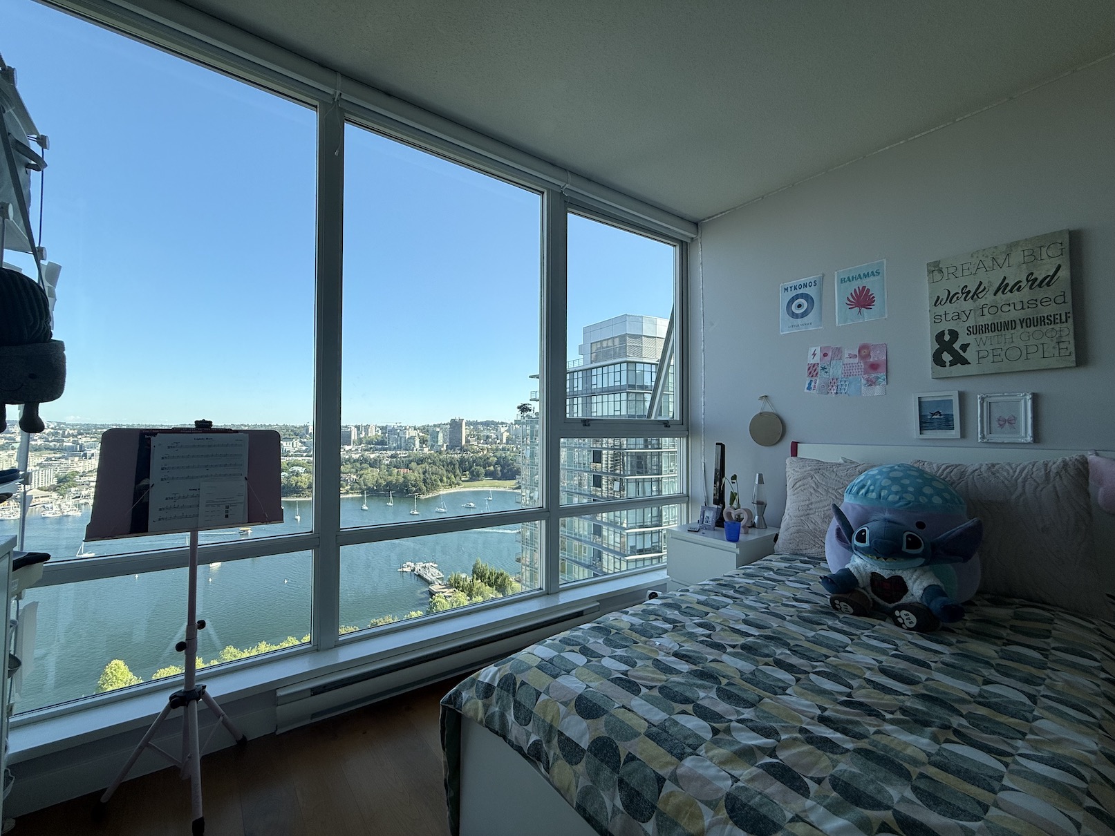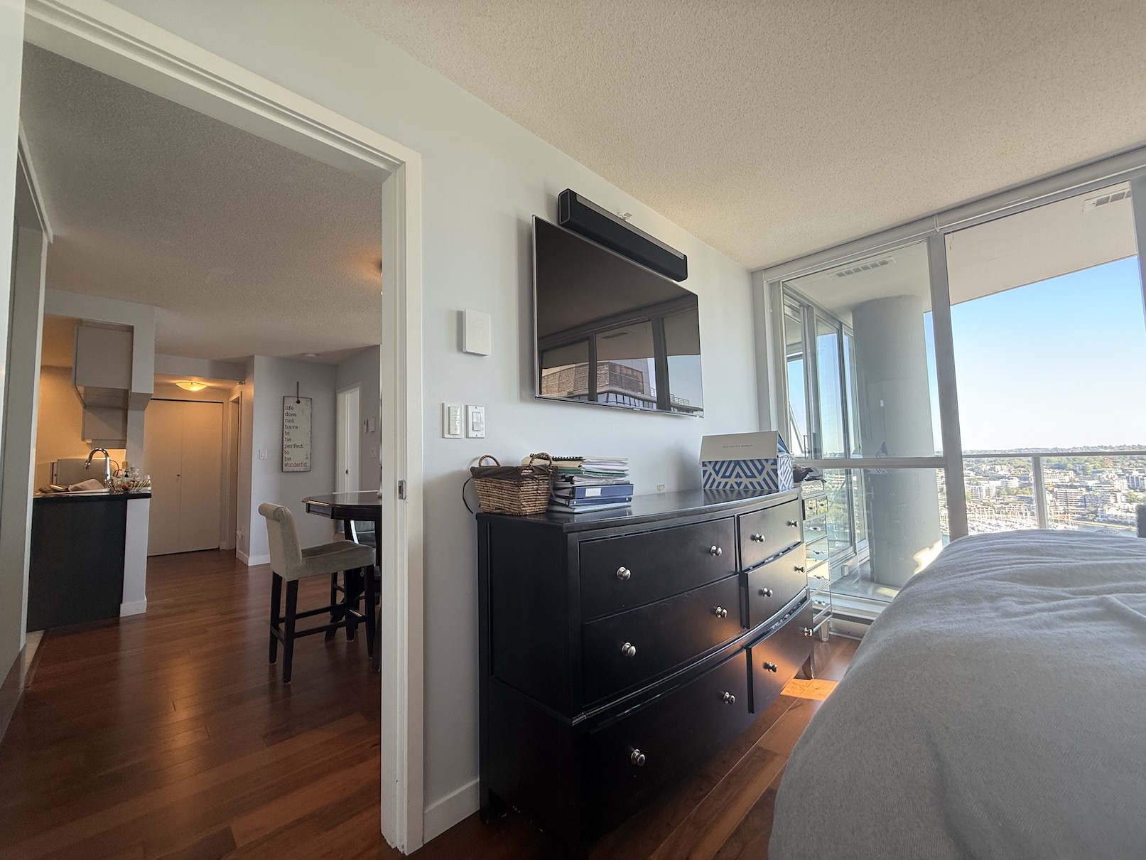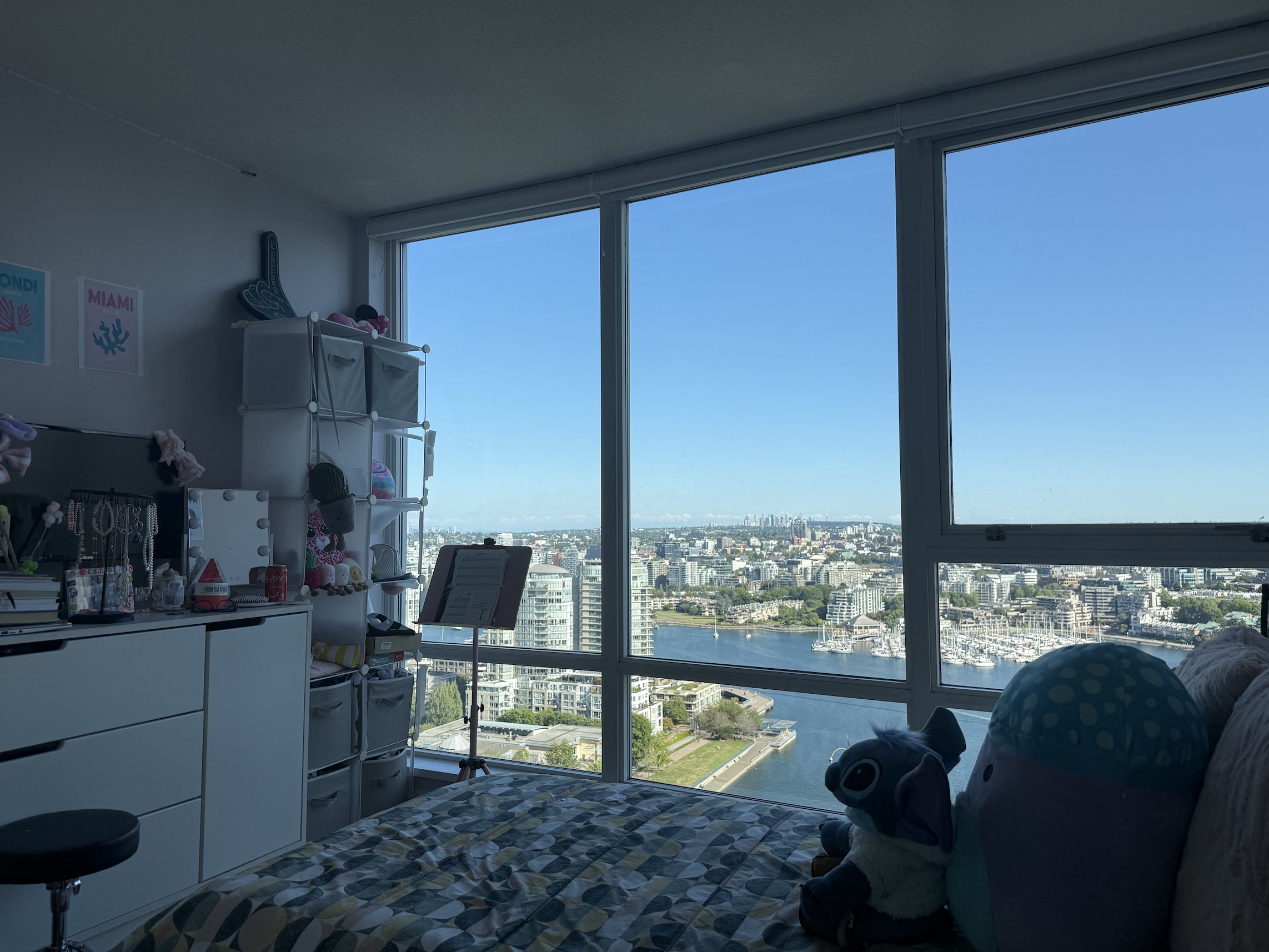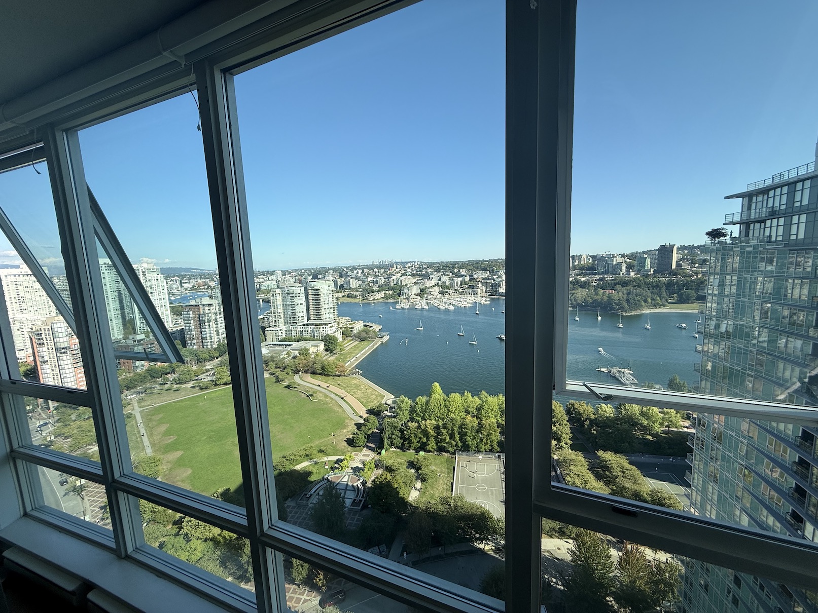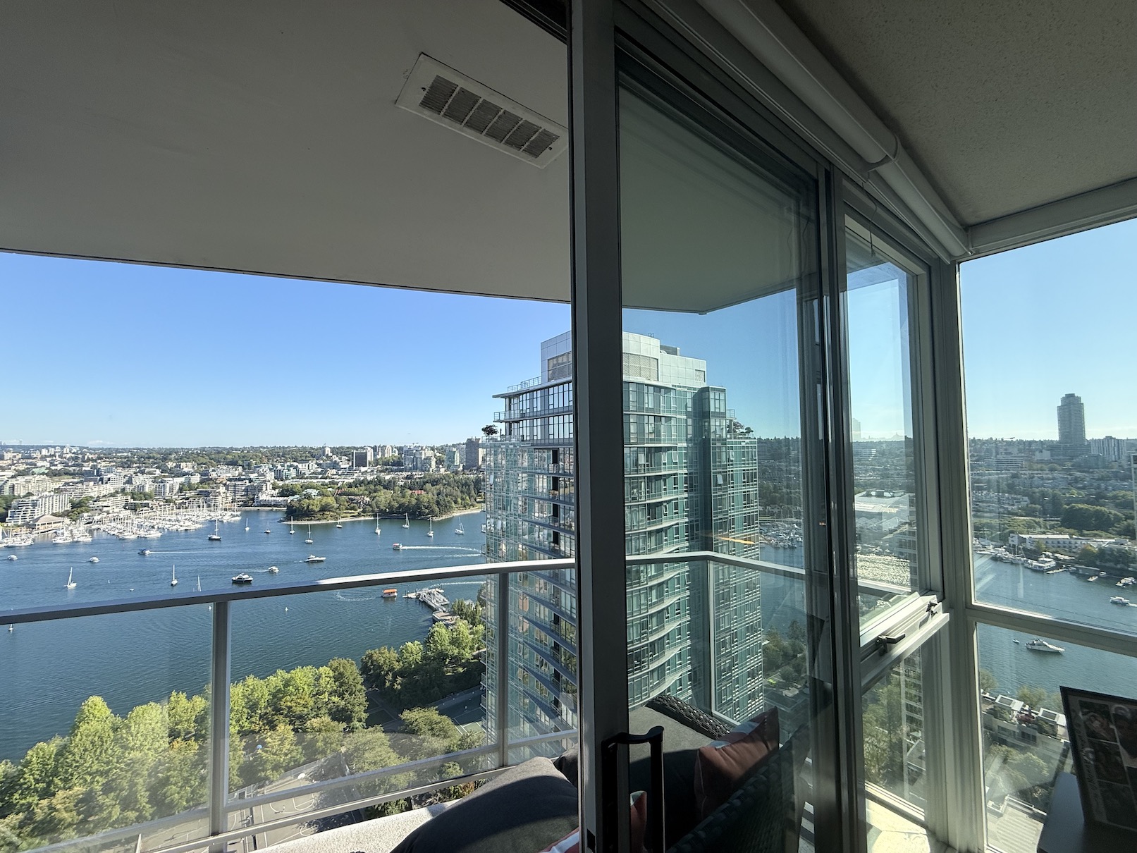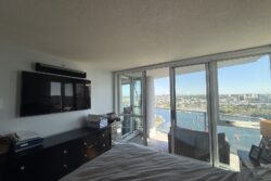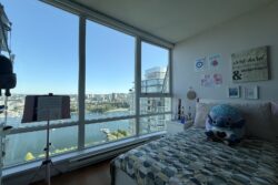 This is a South East facing unit, with incredible unobstructed water views of False Creek from the Living Room, the Balcony and both Bedrooms.
