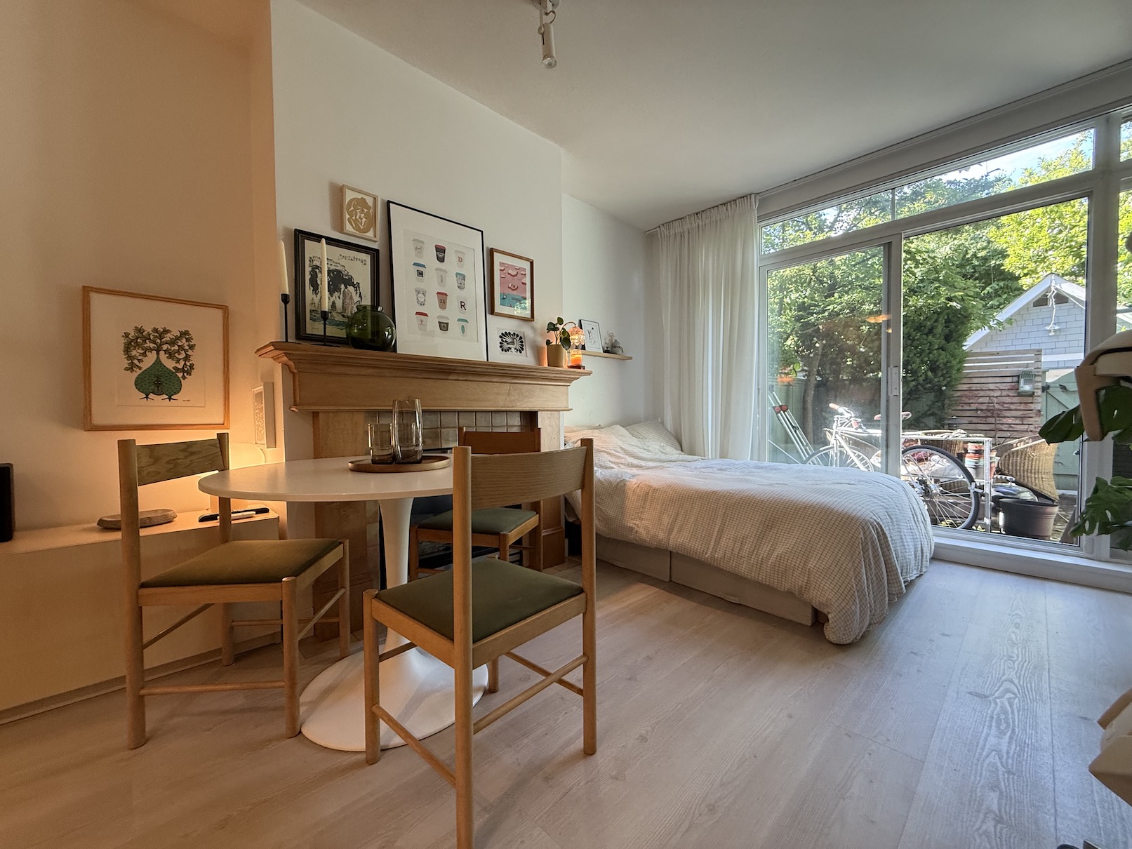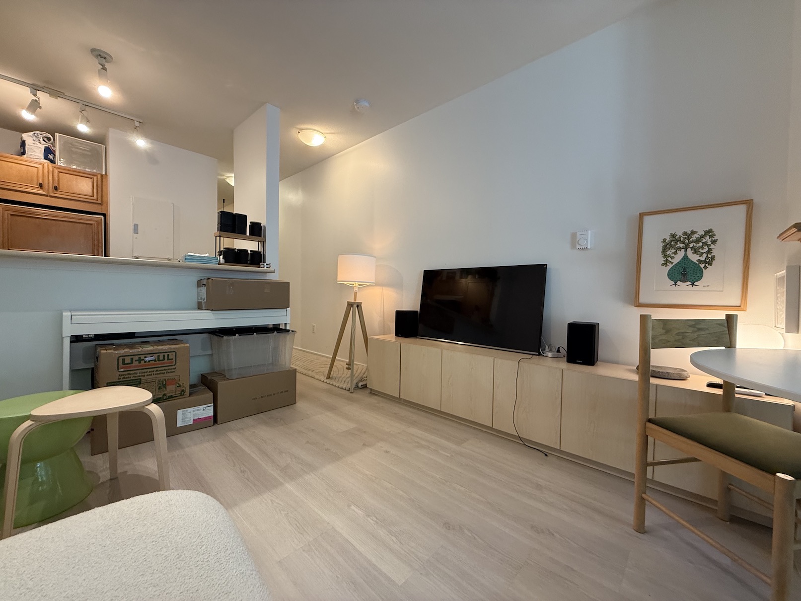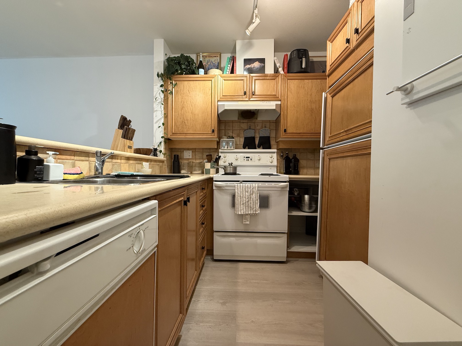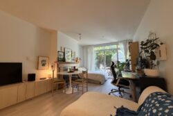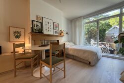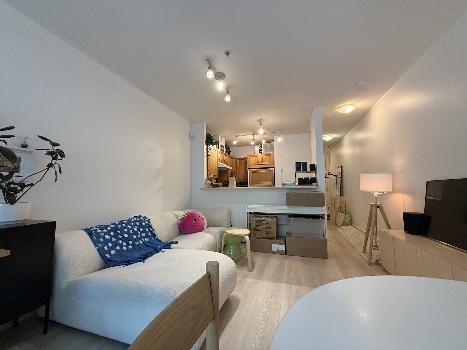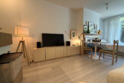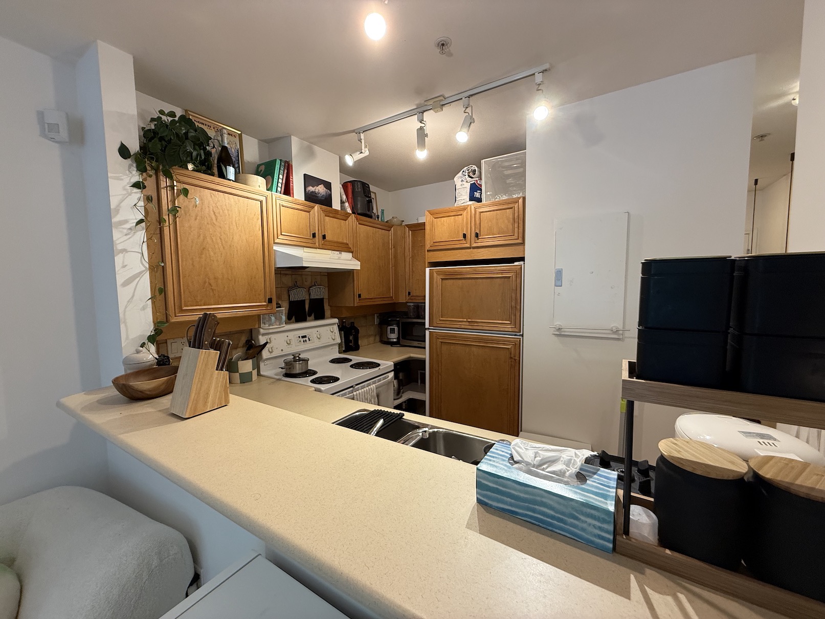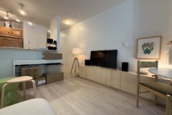 The Apartment for Rent is a studio apartment with open style kitchen off the main Living Area. The kitchen includes a dishwasher in addition to the stove/oven and fridge.