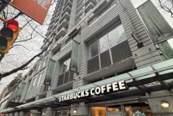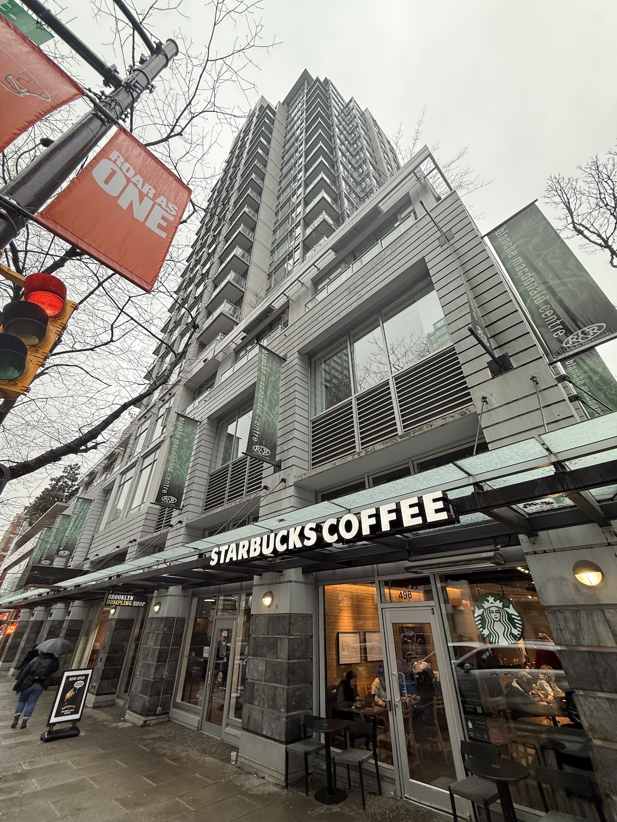 There is a balcony with great views over Robson Street & the Vancouver Public Library.