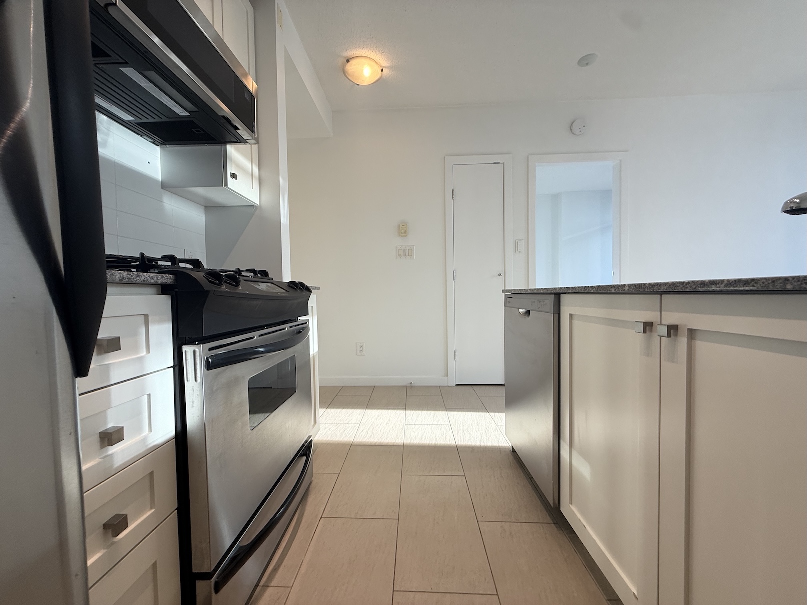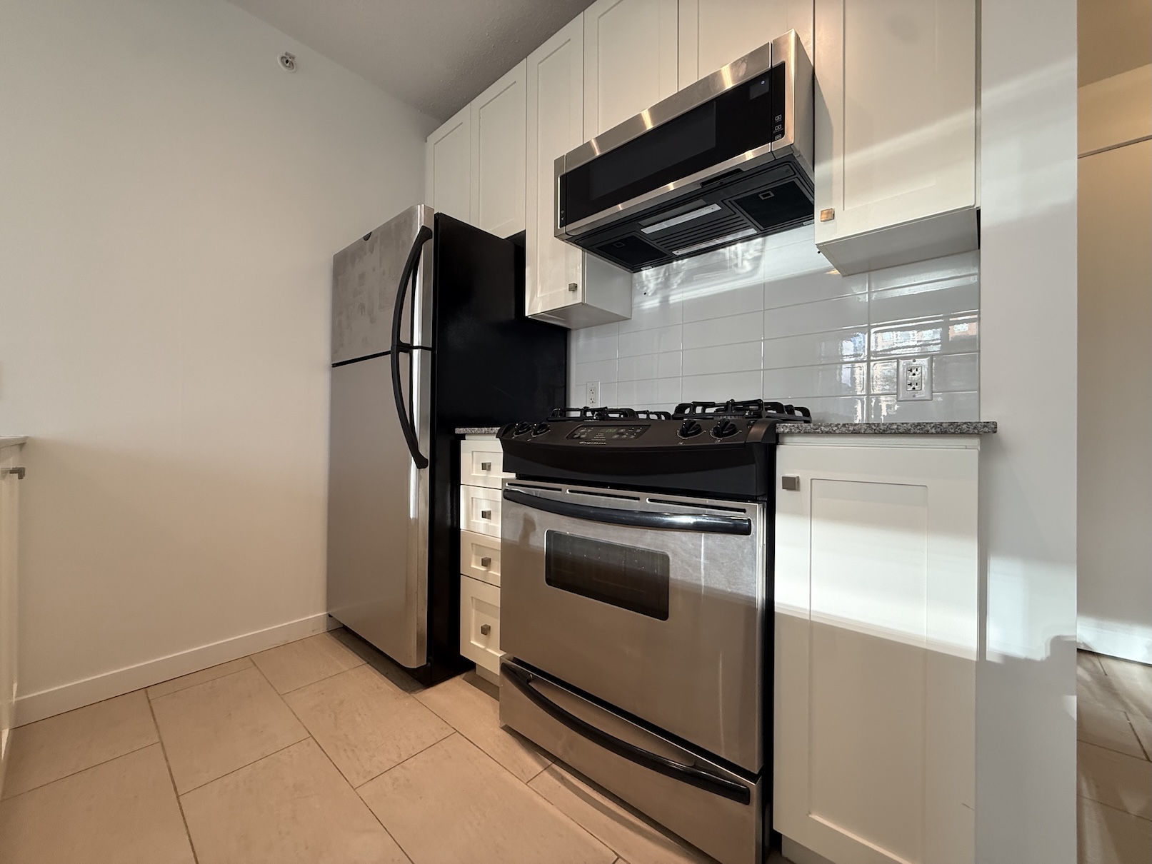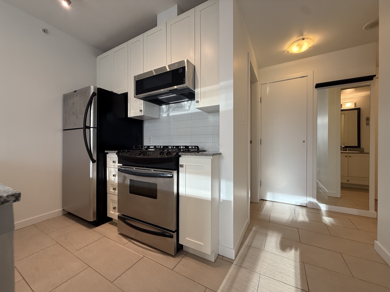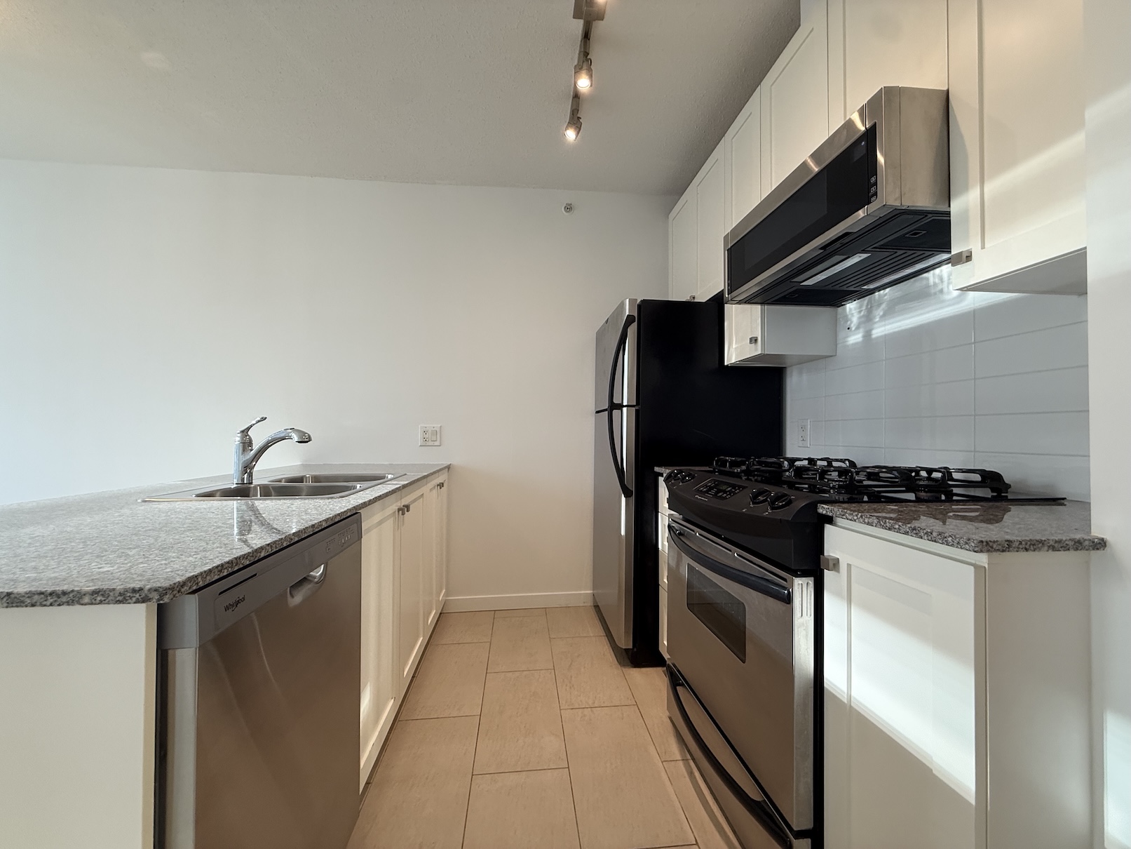 The Kitchen is open to the Living Room, and includes stainless steel fridge, dishwasher, microwave, oven and a gas stove.