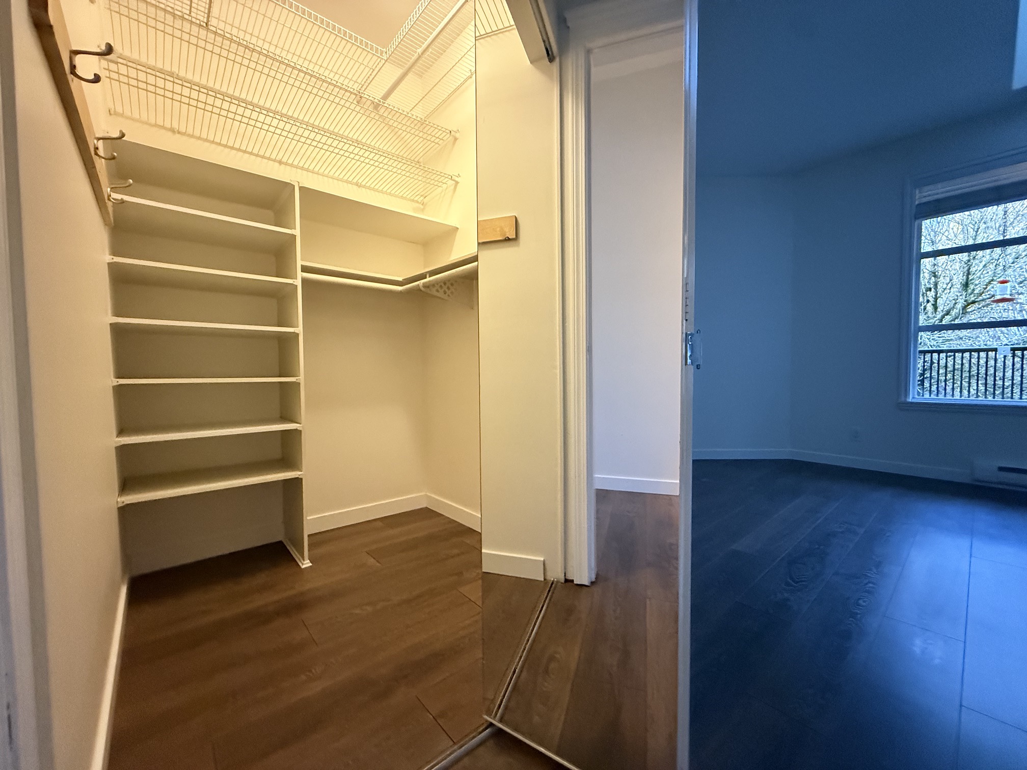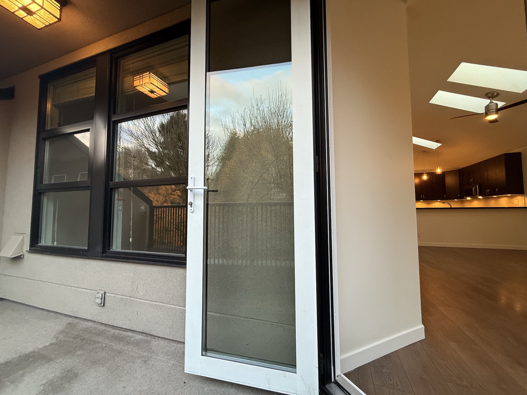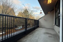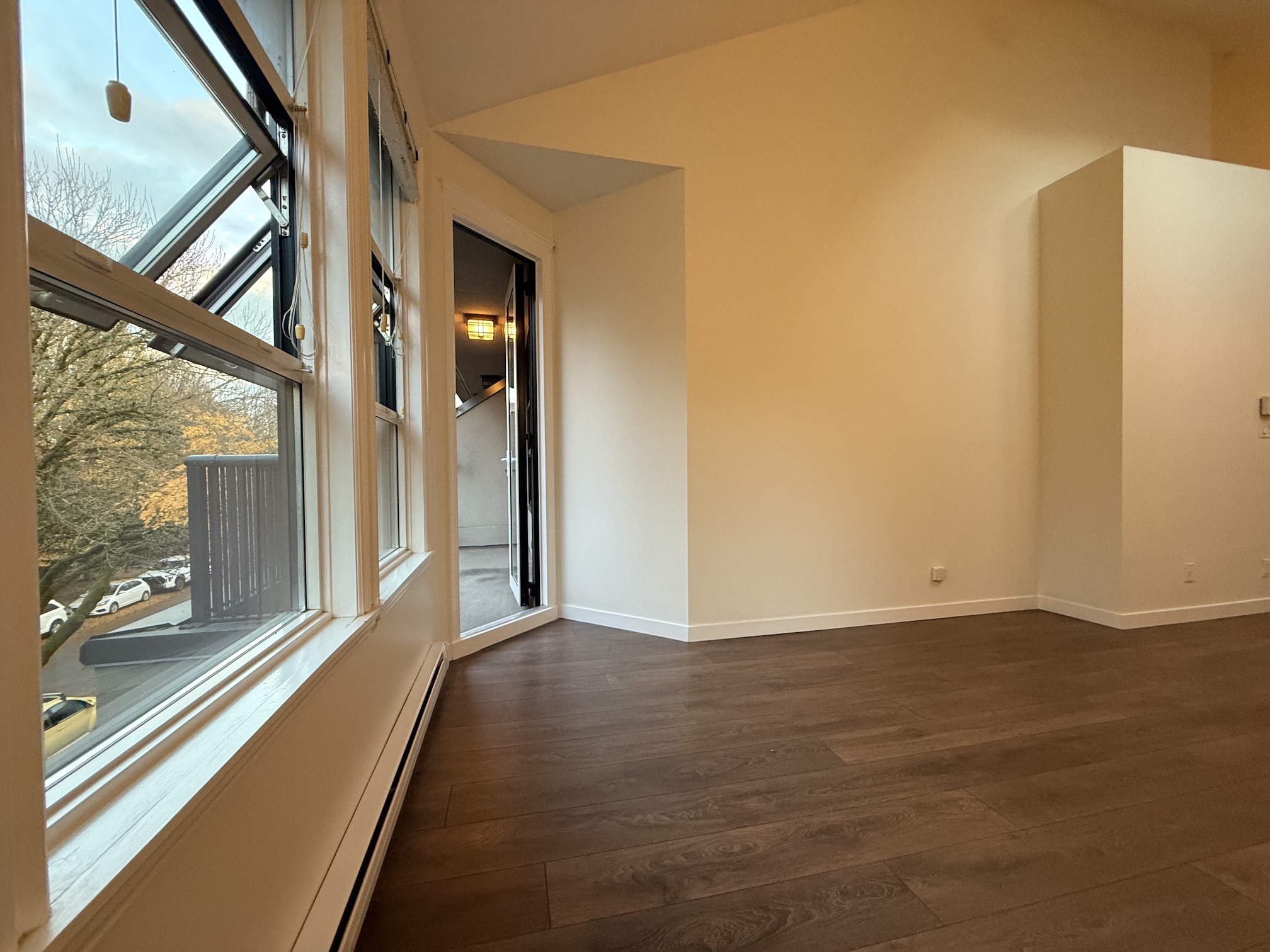 The balcony overlooks the treetops of West 6th Avenue, and as it is a covered balcony, it is usable even on a rainy day.