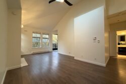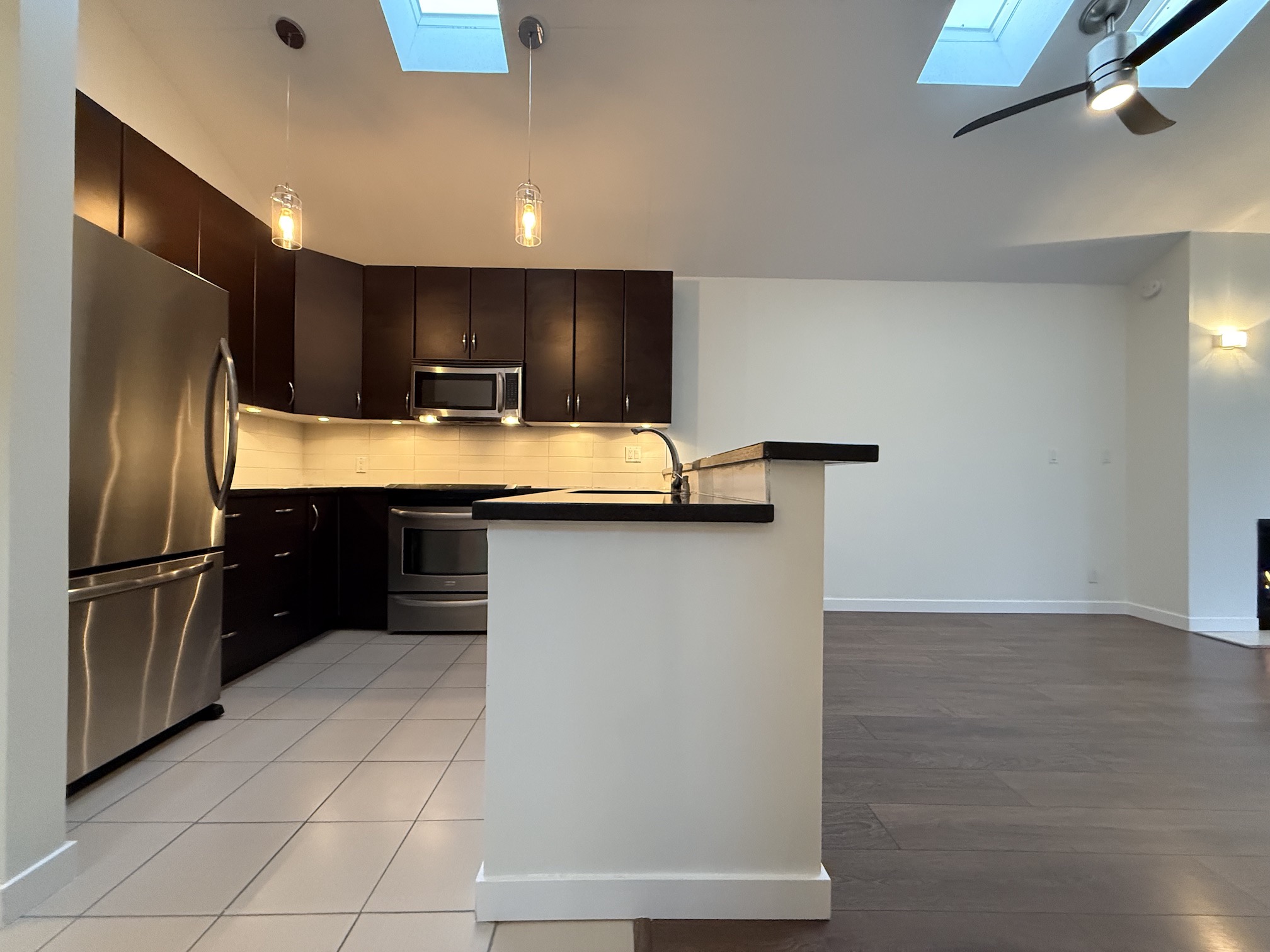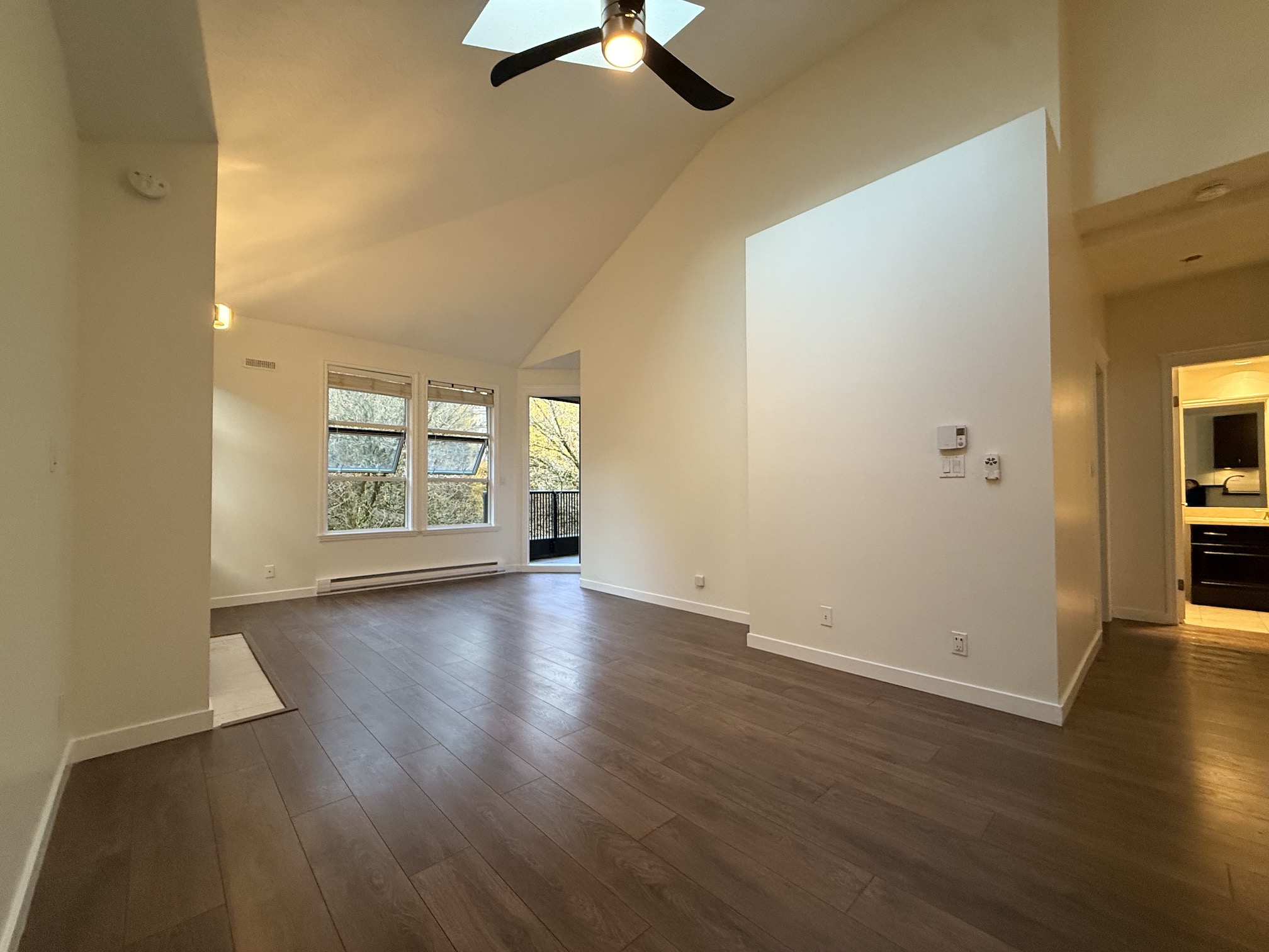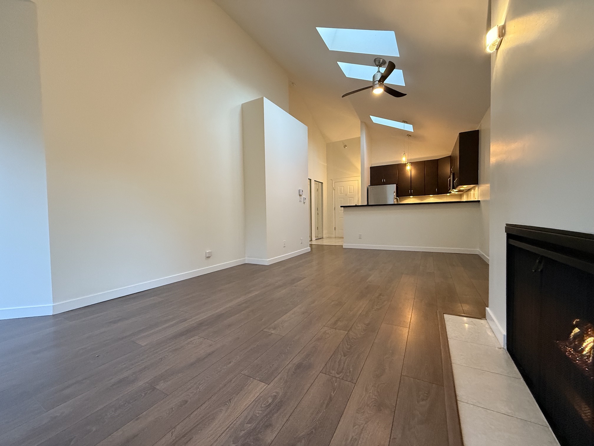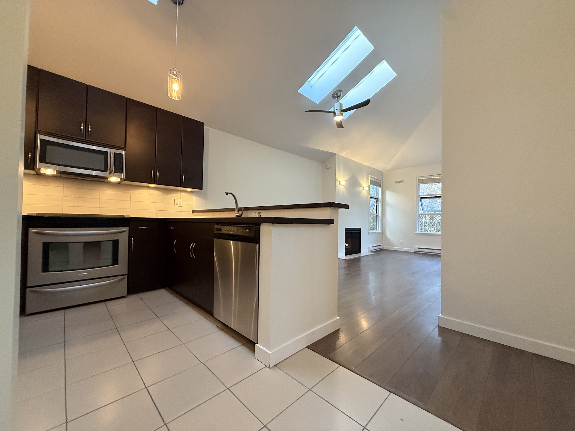 The Living Room and Dining Room areas are combined, next to open style kitchen, and include a gas fireplace, laminate wood flooring and access to the balcony. Vaulted ceilings with 2 skylights in this room create a main living space that feels both bright and open.