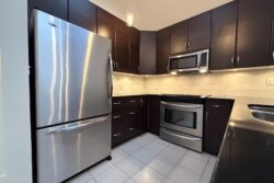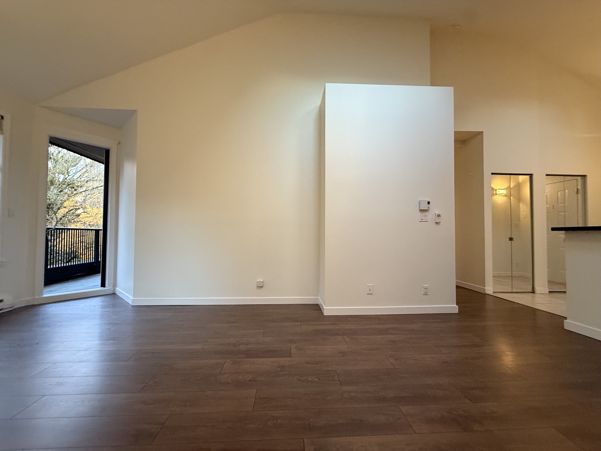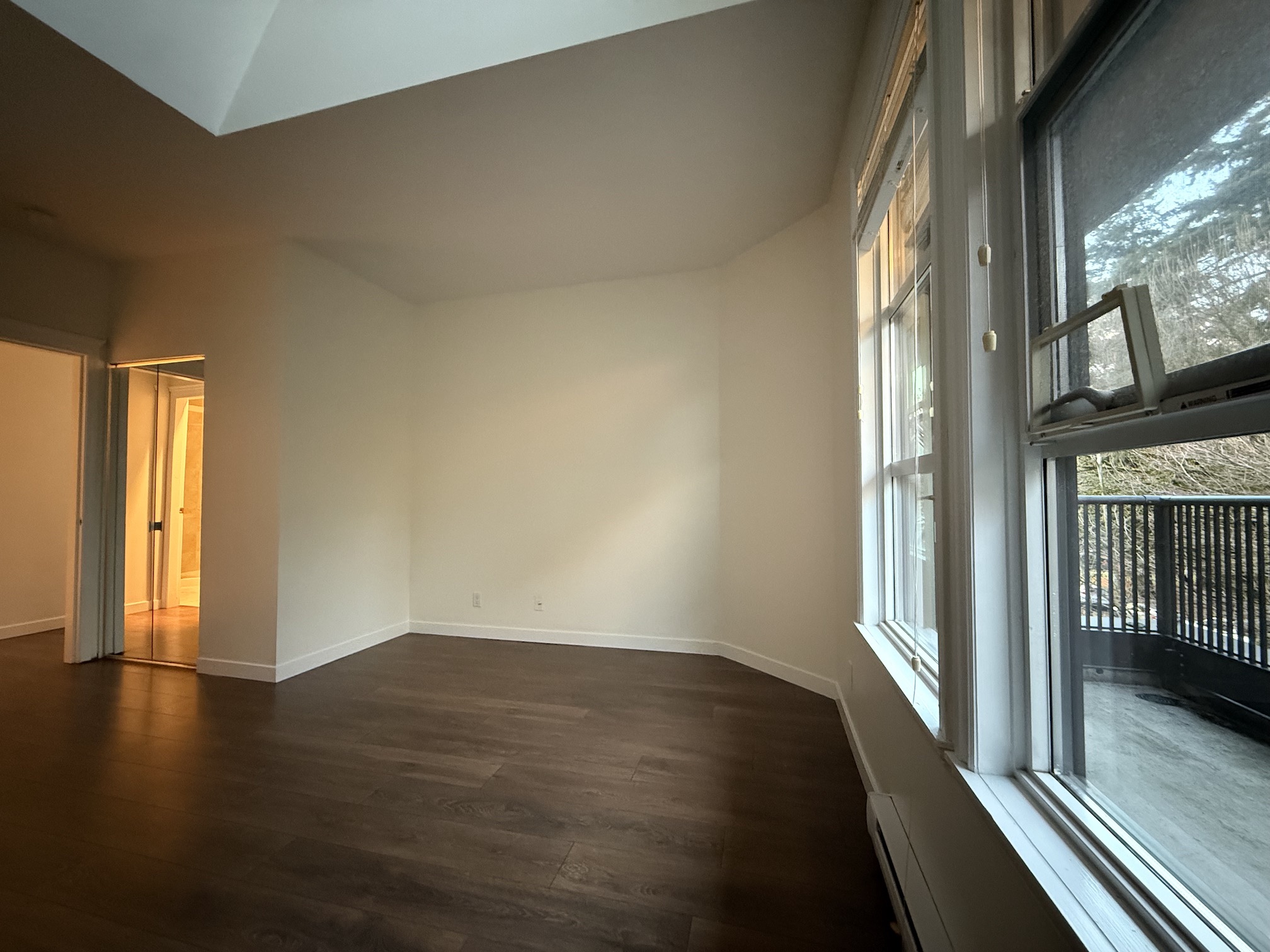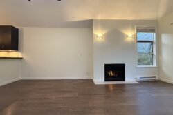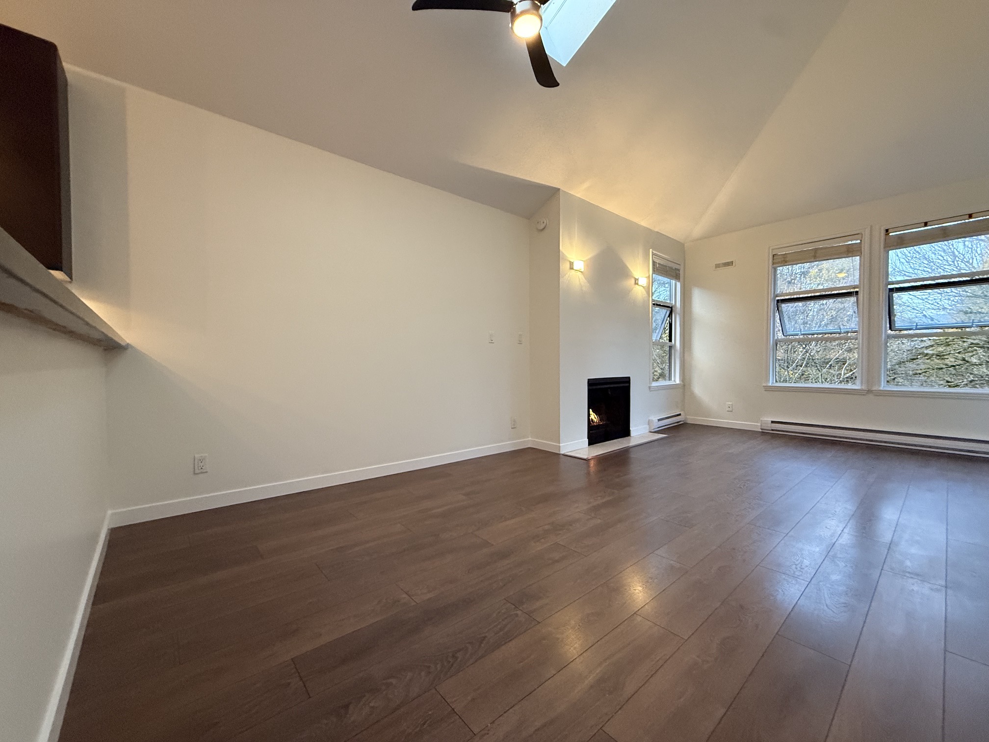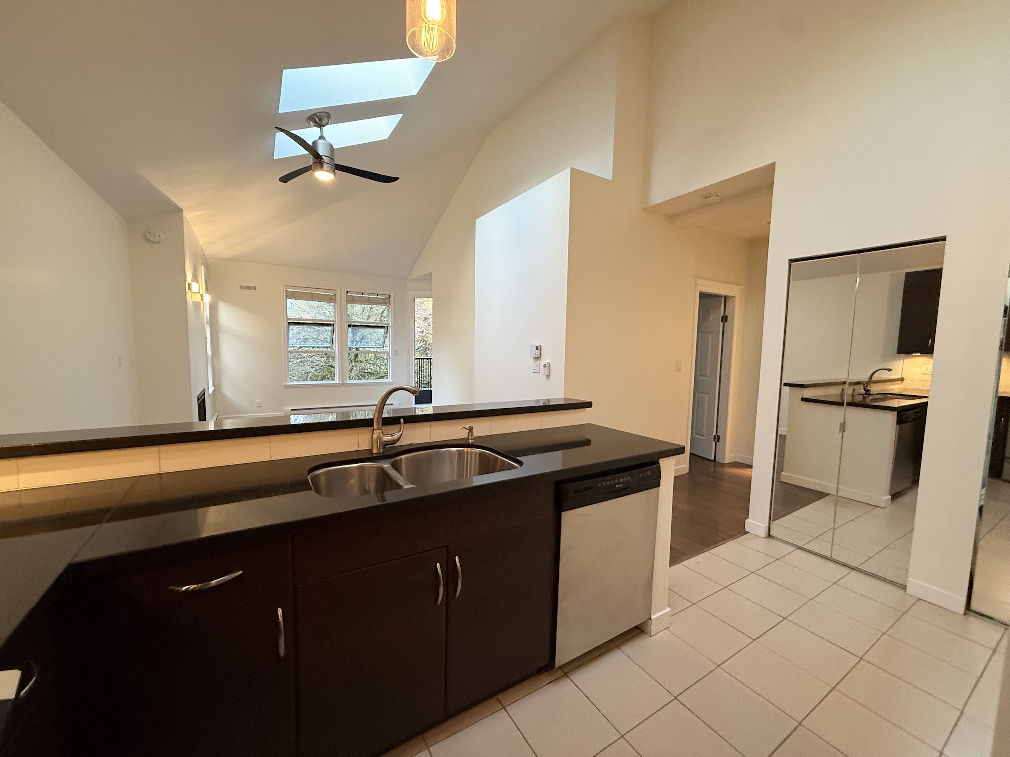 The Living Room and Dining Room areas are combined, next to open style kitchen, and include a gas fireplace, laminate wood flooring and access to the balcony. Vaulted ceilings with 2 skylights in this room create a main living space that feels both bright and open.