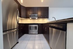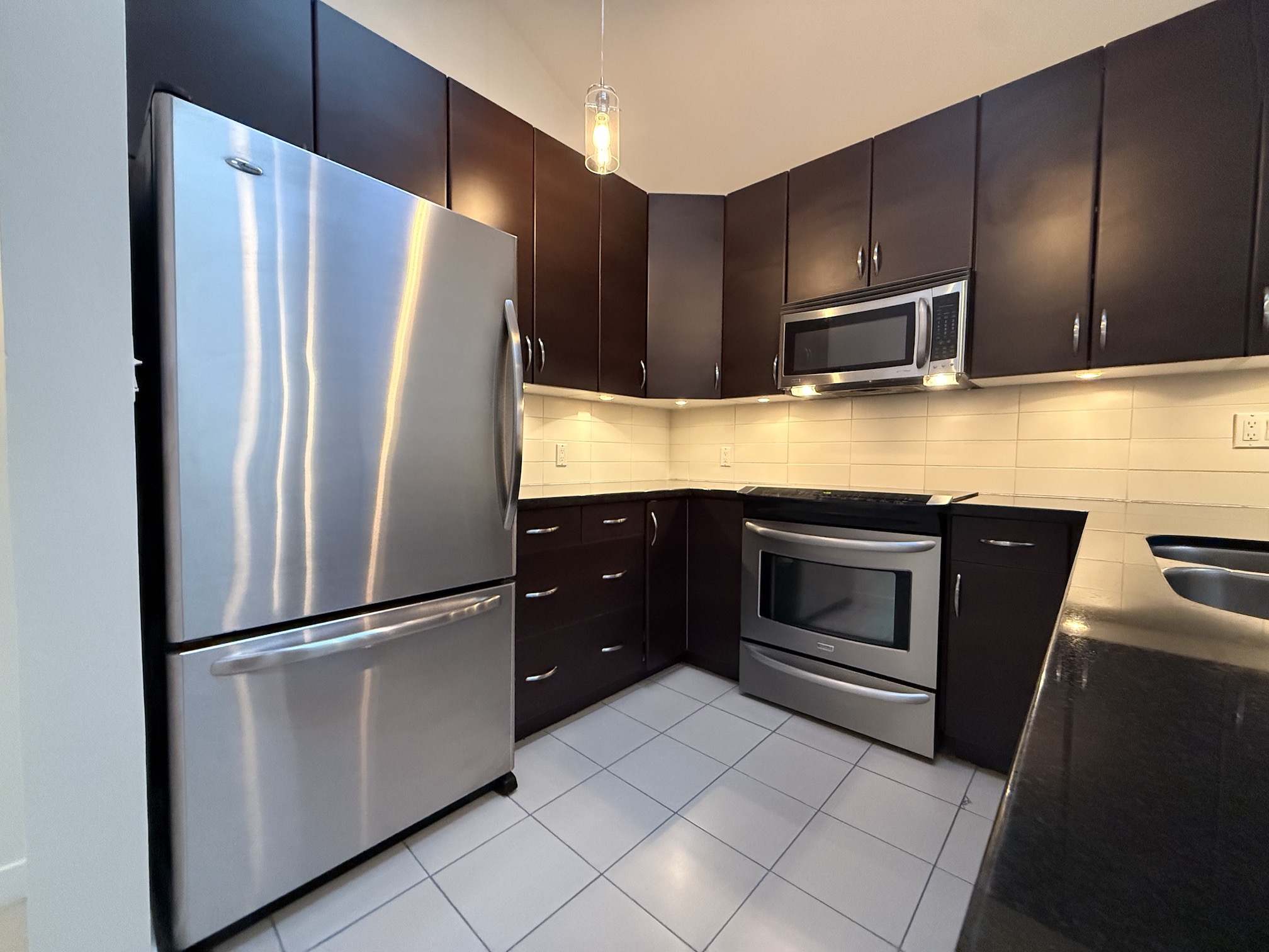The Kitchen has granite countertops and stainless steel appliances, which include the fridge, stove/oven, dishwasher and a microwave.