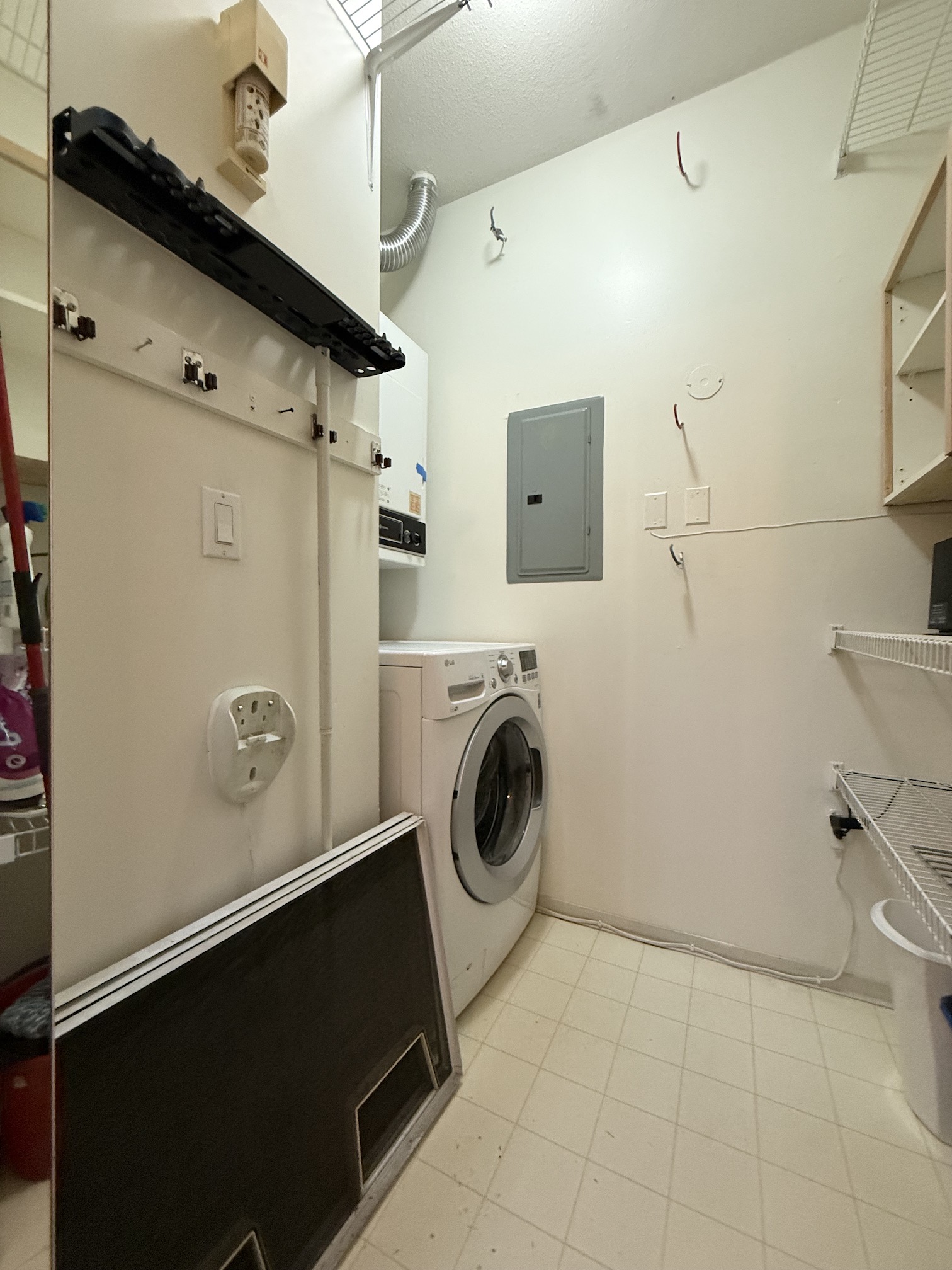 There is a storage room located across from the kitchen which has a washer and dryer, along with space for extra storage.