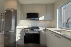 The Kitchen is just off the Living Room, and includes a stainless steel fridge, stove/oven, dishwasher and a microwave. There is a large window over the kitchen sink for added natural light.