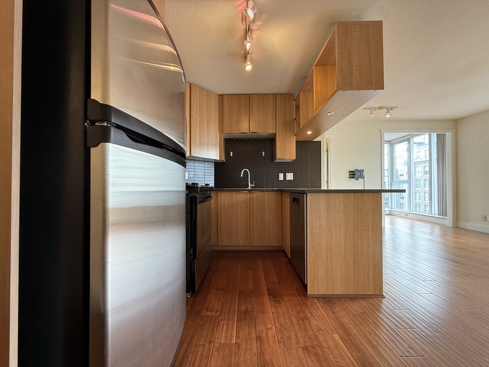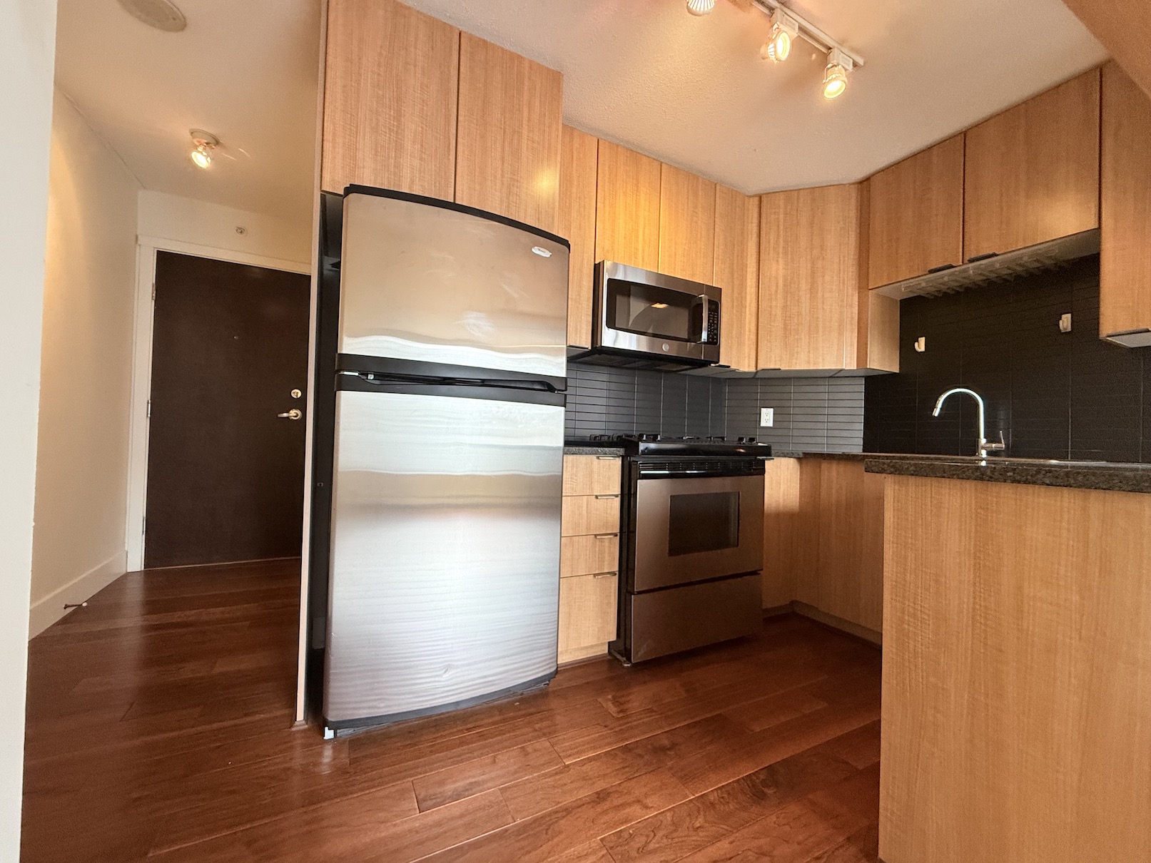 The Kitchen is open style with bar seating, sleek black tiled back splash wall and stainless steel fridge, dishwasher, gas stove, oven and microwave.