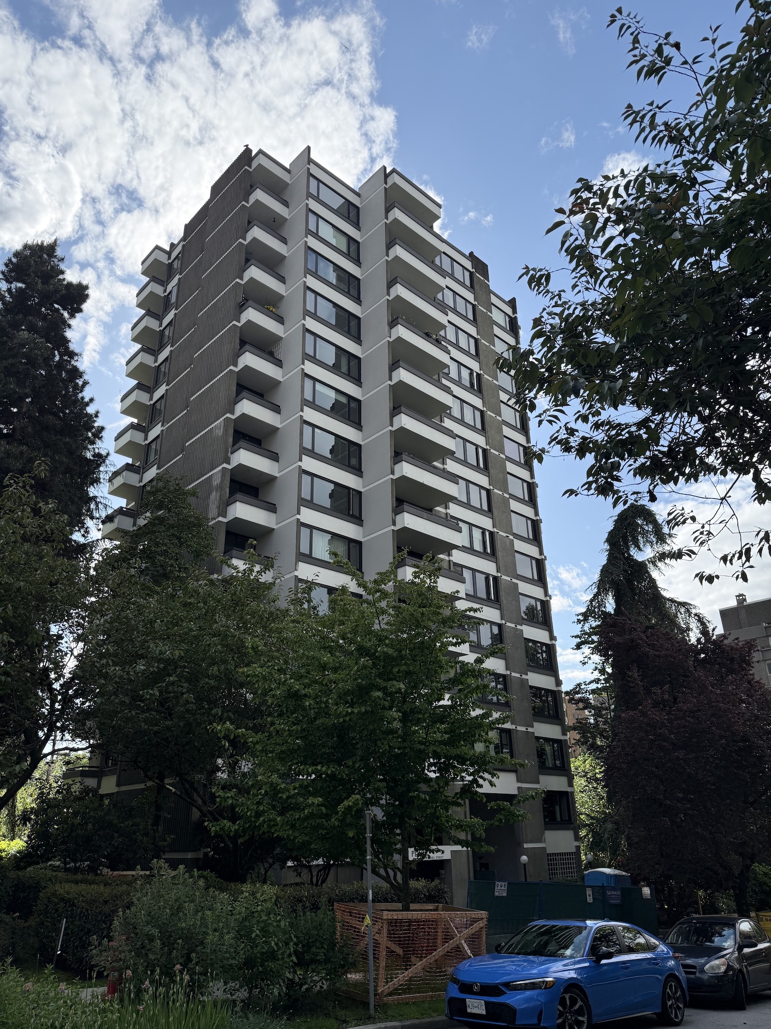 Haro Place is a 13 Level strata building located on the corner of Haro and Nelson in the West End, just 1 block to Robson Street. The building construction is concrete, providing a solid, soundproof interior between walls and floors.