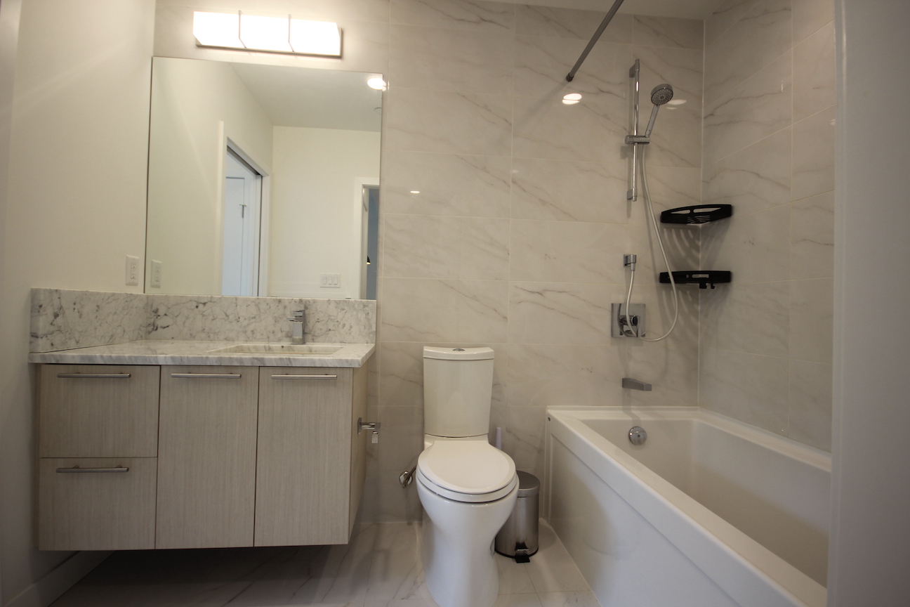 The bathroom is bright and modern, and includes a bathtub.